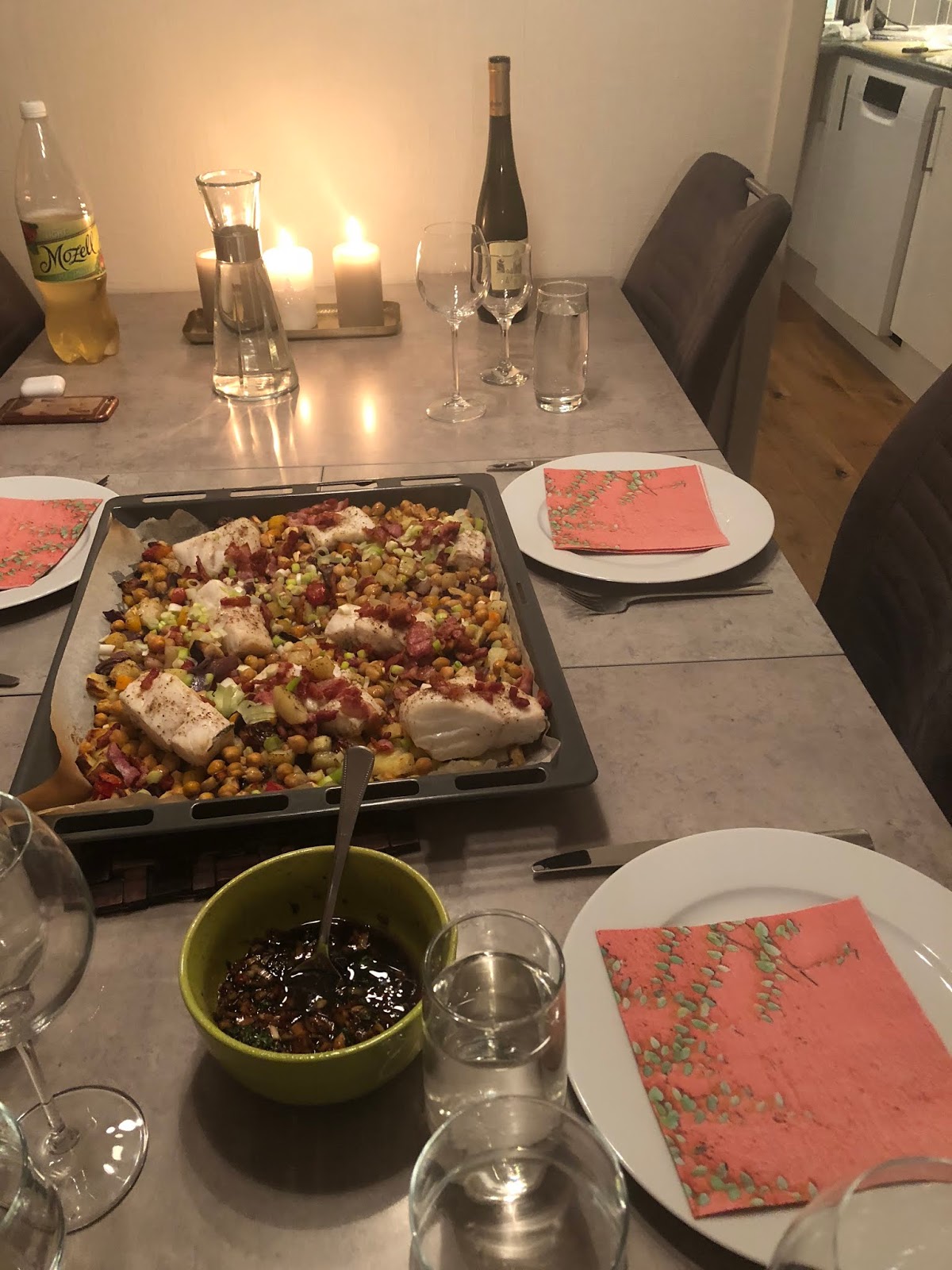 Etter hvert ble det servert middag med fersk torskefilet på en seng av grønnsaker. Den smakte nydelig. Senere ble det kaffe og kaker. Et hyggelig selskap.
